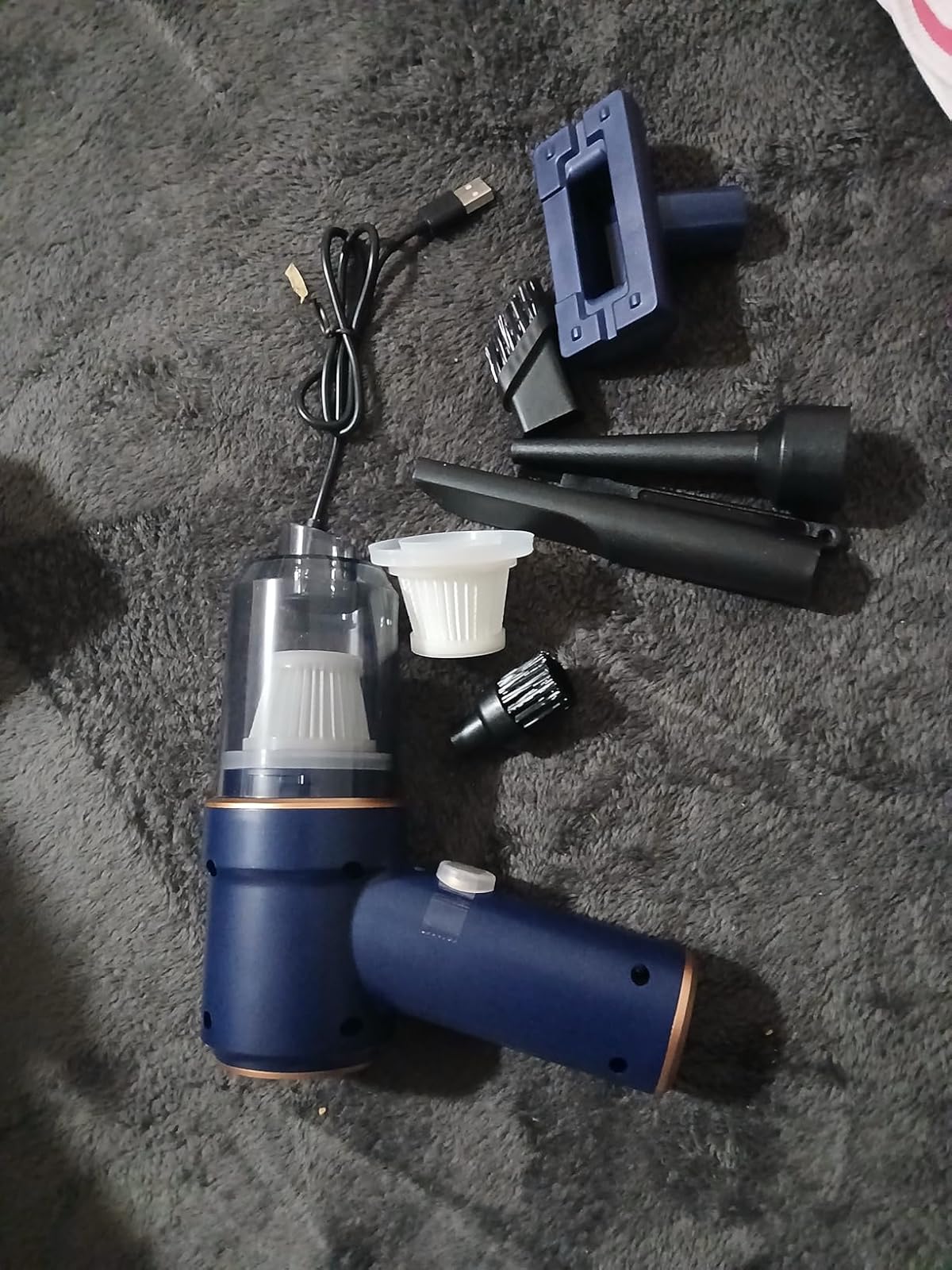 - âĄăVacuum Cleaner & Air Duster 2 in 1ăThe cordless hand held vacuum has both suction and blowing capabilities, not only to remove dust and debris, but also to inflate. You can use it to easily blow away debris, dust, etc. from the surfaces of items, and also remove debris, pet hair, and dust effortlessly from the crevats of keyboards, carpets, etc. In addition, it can also be used as a barbecue fan and inflate the swimming circle, etc., providing convenience for family entertainment or outdoor activities. This mini vacuum cleaner has various functions and is a good assistant in your daily life