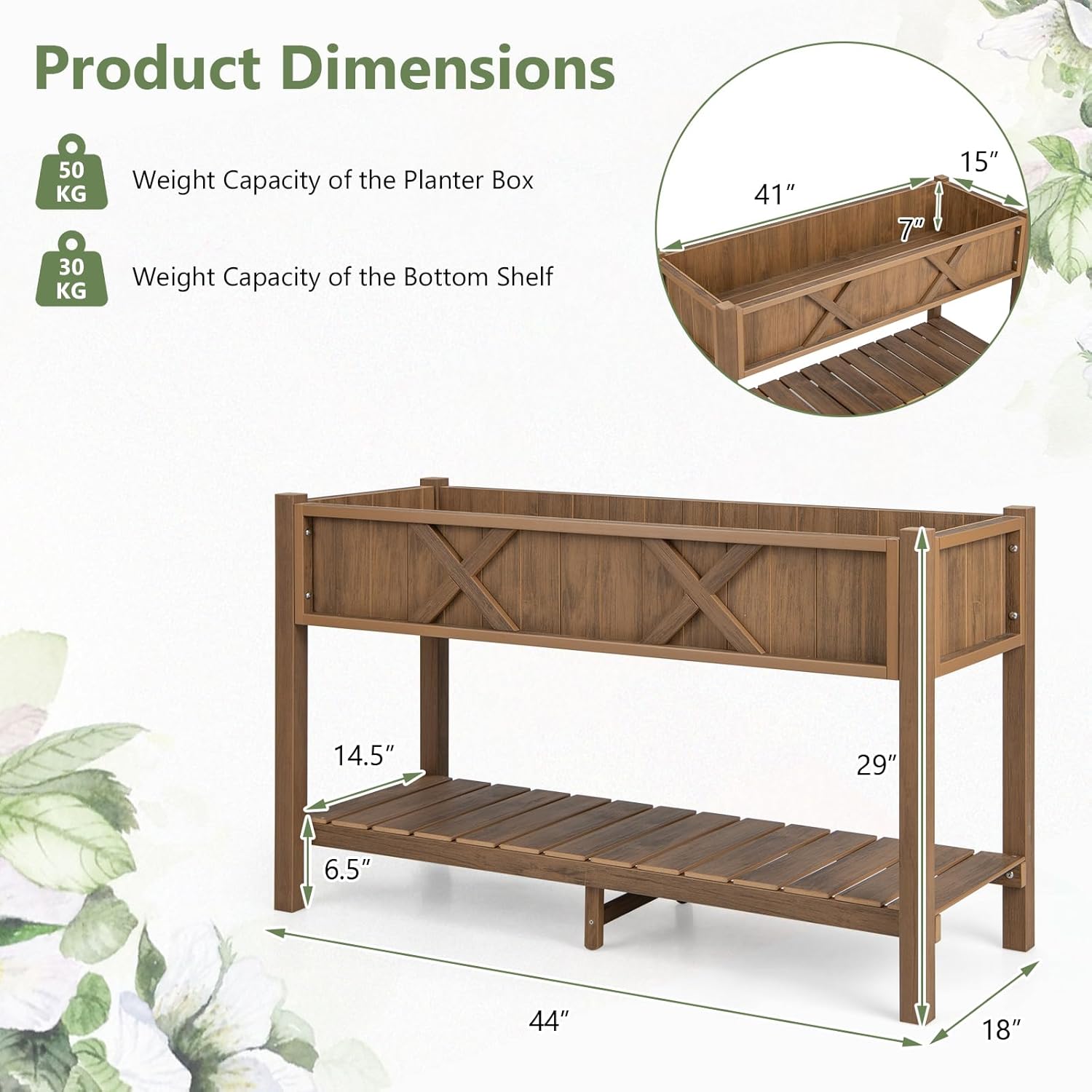Giantex HIPS Raised Garden Bed, Elevated Planter Box w/Legs, Storage Shelf, Drainage Holes, Weather-Proof Standing Raised Beds for Backyard Porch Flower Herb (Coffee, 44″ x 18″ x 29″)