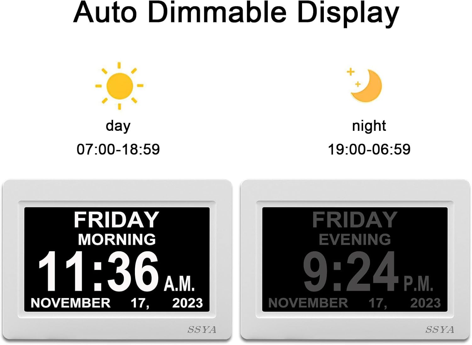 SSYA Digital Calendar Alarm Clock – Dementia Clocks for Vision Impaired, Elderly, Memory Loss Clock with Non-Abbreviated Clock with Date and Day (7 inch)