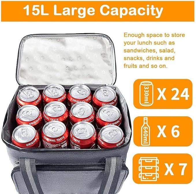 - Large Capacity: The lunch bag has a capacity of 15L, which is large enough to hold a variety of food, such as sandwiches, fruits, snacks, drinks, etc. The lunch box is designed with a separate compartment for hot food, which can keep the food warm. The front pocket is designed for storing small items such as napkins, keys, or mobile phones.