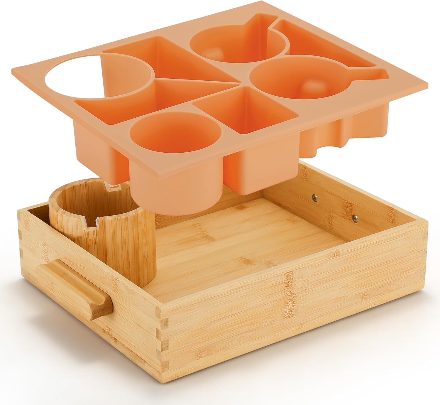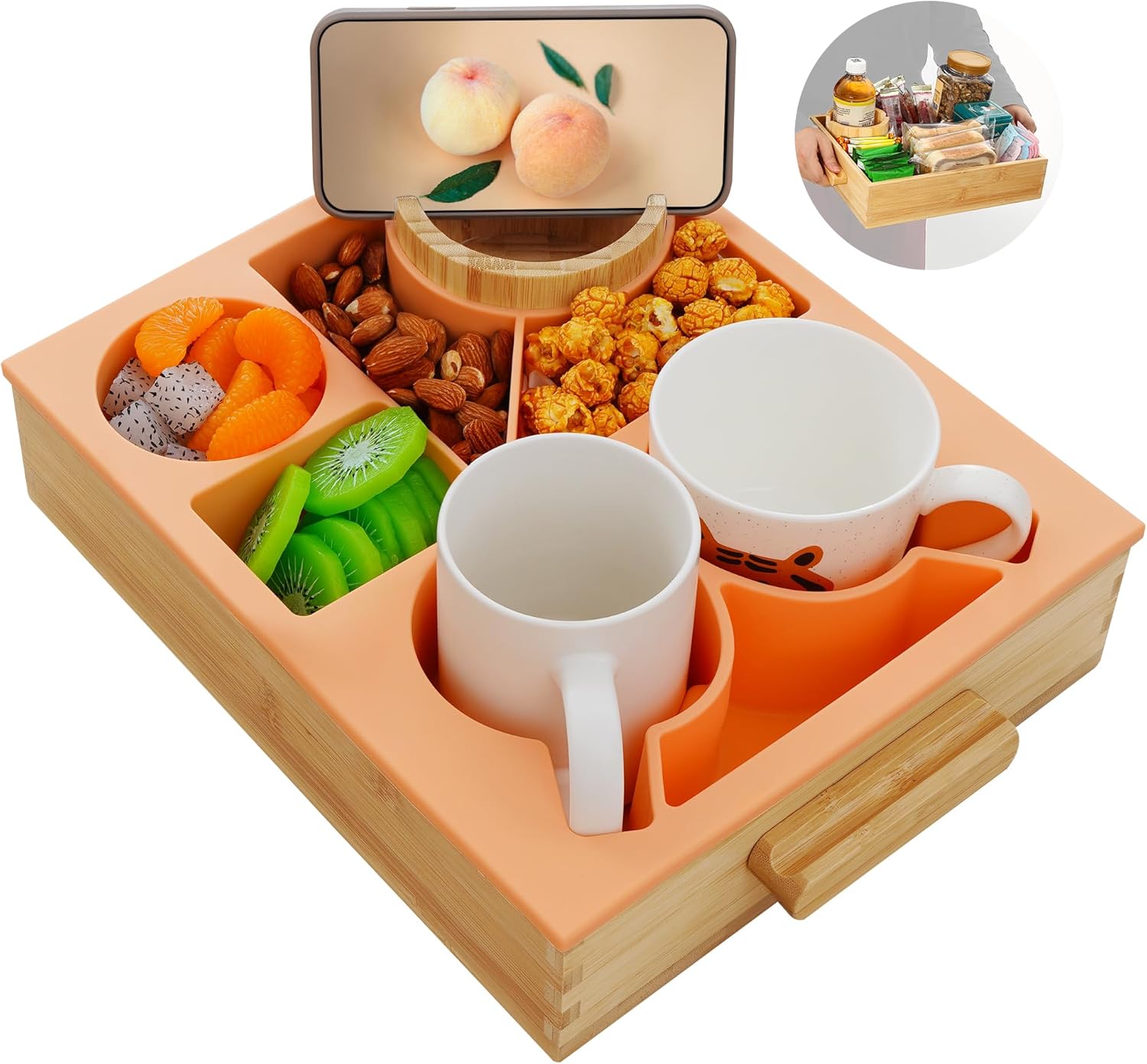 Nnewvante Snack Cup Couch Caddy, 8 in 1 Divided Serving Tray with Handle for Sofa Bed RV Car Organizer Caddy Movie Night Snack Trays, Bamboo and BPA Free Silicone, Peach